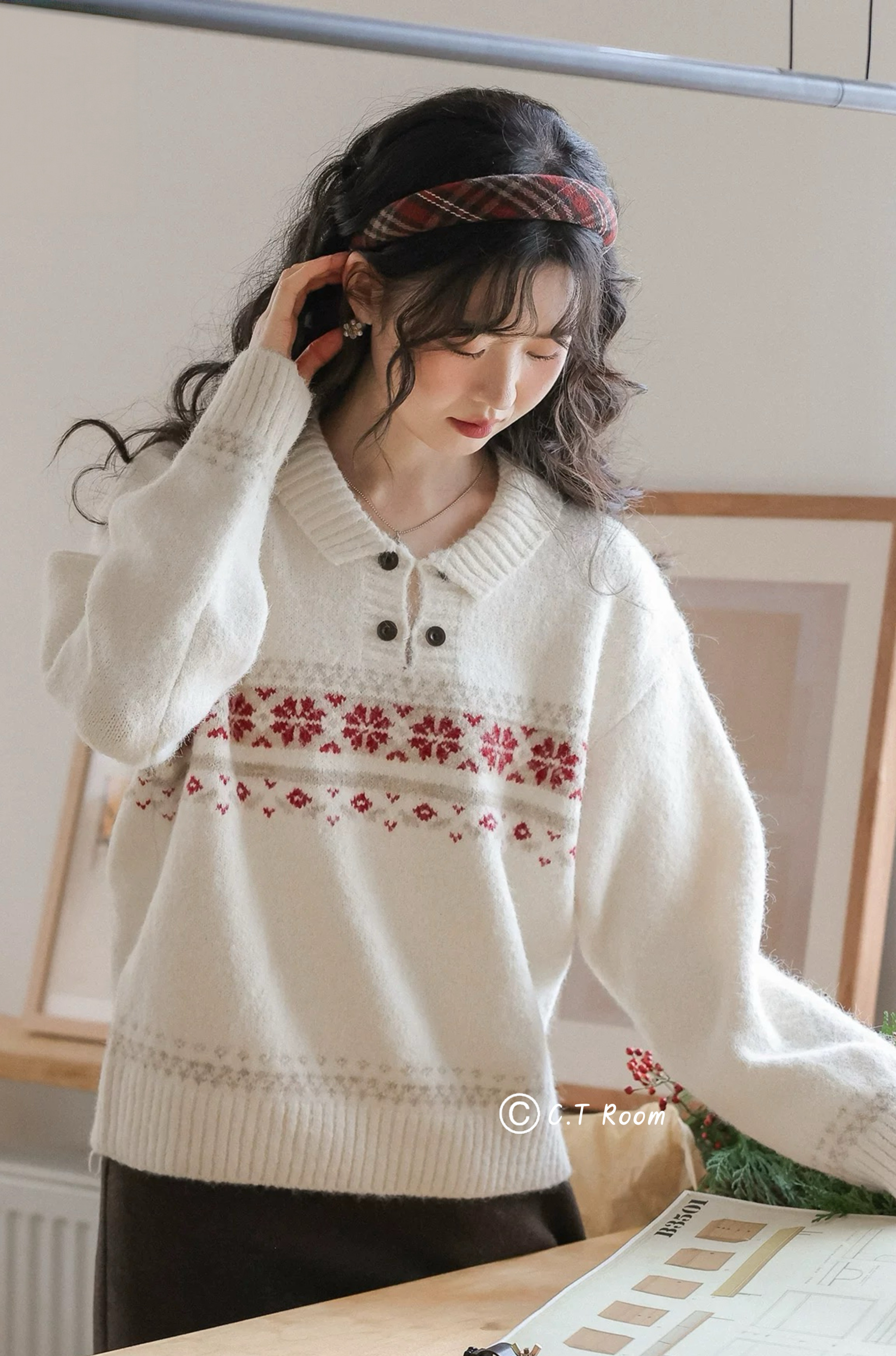 雙釦翻領雪花針織毛衣